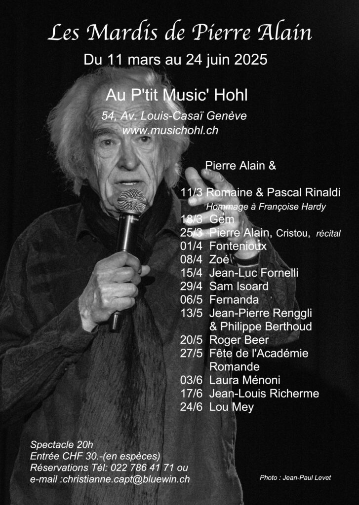 Déroulement: À 20 heures, Pierre Alain entrera le premier sur scène pour un tour de chant de sa plume, sensible, réaliste, drôle, poétique, souvent autobiographique, renouvelé de semaine en semaine. En seconde partie, après l’entracte, l’invité de la soirée qui, nûment, vous emmènera dans son propre univers, en 45 minutes.